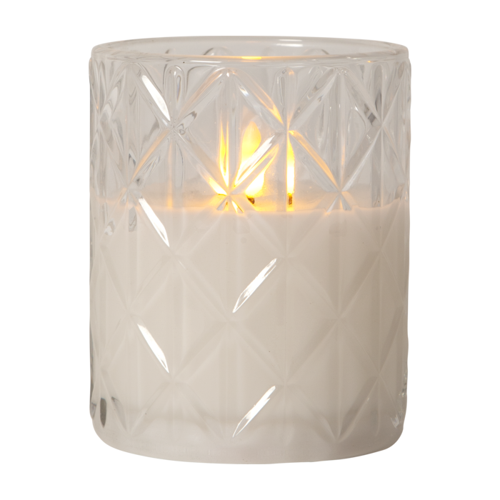 Breng een stijlvolle sfeer in huis met deze LED stompkaars in geribbeld glas. De kaars is omhuld met transparant glas met een elegant patroon, waardoor het licht op een unieke en sfeervolle manier wordt verspreid. Binnenin bevindt zich een realistische waxkaars met een warme witte LED-vlam.