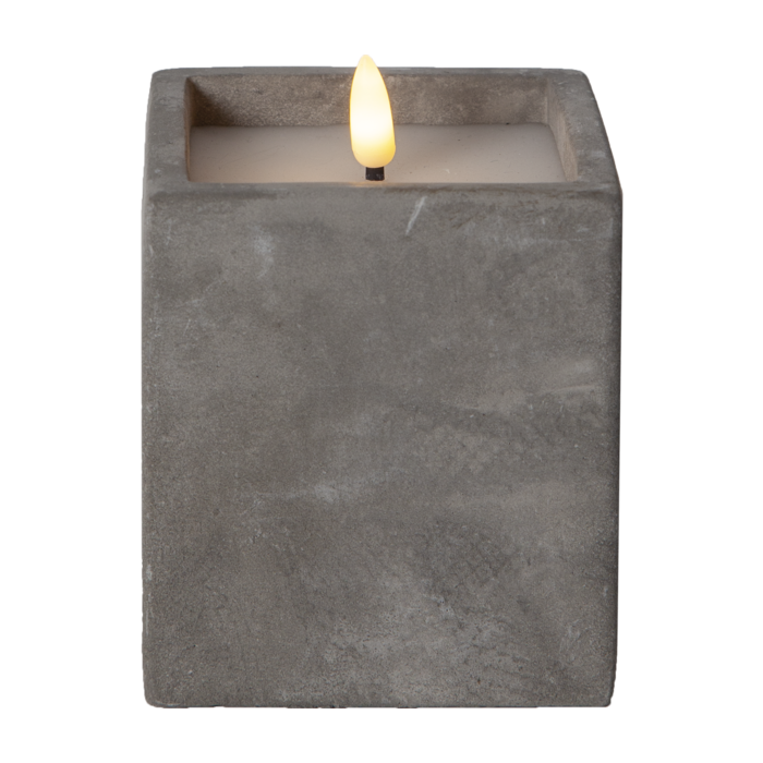 Breng een moderne touch in huis met de vierkante LED stompkaars met betonlook. Deze unieke kaars combineert de robuuste uitstraling van cement met de warme gloed van een realistische LED-vlam. Het buitenste gedeelte is gemaakt van cement, terwijl de binnenkant bestaat uit wax.