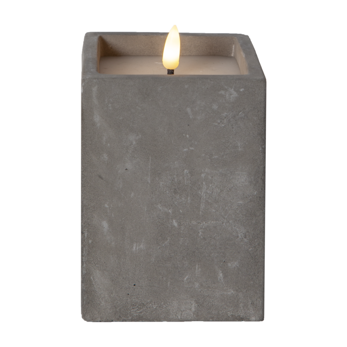 Breng een moderne touch in huis met de vierkante LED stompkaars met betonlook. Deze unieke kaars combineert de robuuste uitstraling van cement met de warme gloed van een realistische LED-vlam. Het buitenste gedeelte is gemaakt van cement, terwijl de binnenkant bestaat uit wax.
