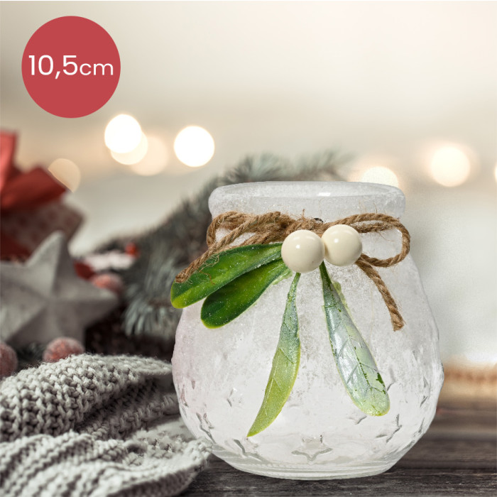 Deze witte glazen waxinelichthouder is een mooie aanvulling op je feestelijke decoraties. De houder heeft een mooie ronde vorm en is versierd met een blaadjes en bessen. Het warme kaarslicht schijnt door het glas en creëert een gezellige sfeer in huis. De waxinelichthouder heeft een diameter van 10,2 cm en is 10,5 cm hoog. Het glas is stevig en kan veilig worden gebruikt met standaard waxinelichtjes.