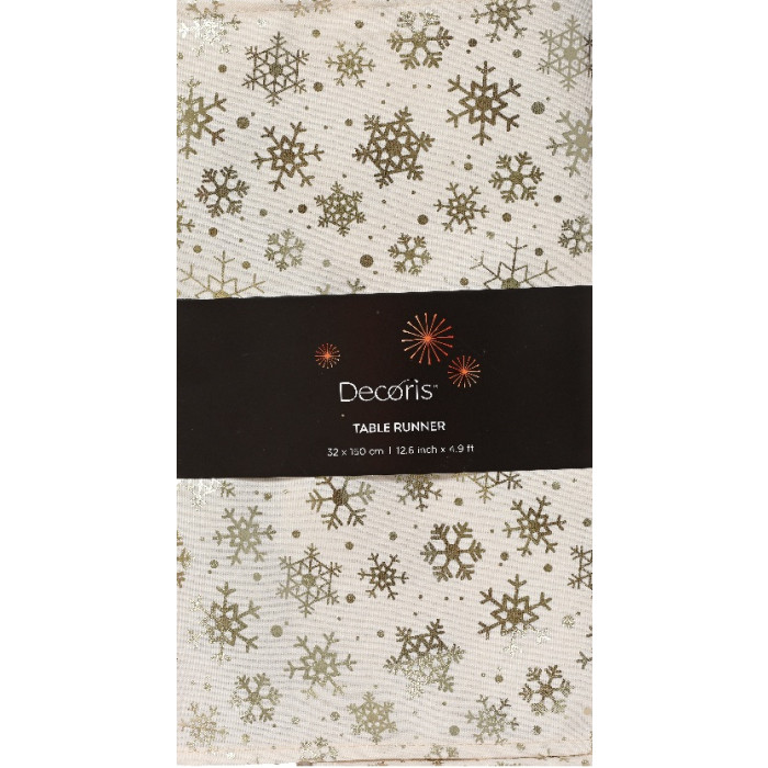 Witte Kerst Tafelloper met Gouden Sneeuwvlokken – 150 x 32 cm
