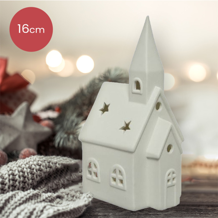 Witte porseleinen waxinelichthouder in de vorm van een kerkje - 16cm