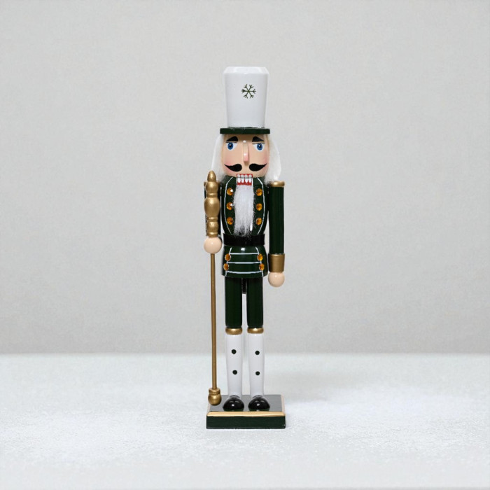 Deze notenkraker van 76 cm hoog springt direct in het oog dankzij het donkergroene uniform met gouden accenten en hoge witte hoed. De notenkraker staat stevig op een rechthoekige voet en draagt een goudkleurige staf in zijn hand. Het ontwerp is klassiek, maar de afmetingen maken de notenkraker tot een indrukwekkend decoratief stuk.