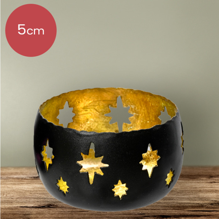 Deze prachtige zwarte gouden ijzeren waxinelichthouder voegt een vleugje stijl en warmte toe aan elke kamer. De sterren in de houder creëren een mooi en sfeervol patroon wanneer het waxinelichtje brandt.