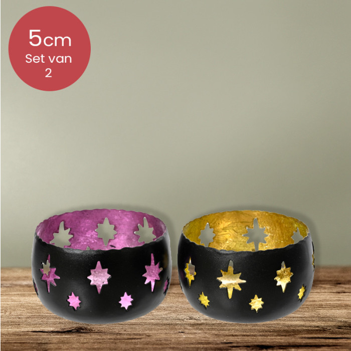 Zwart ijzeren waxinelichthouders met sterren - Duo pack - Ø8,5 x 5 cm